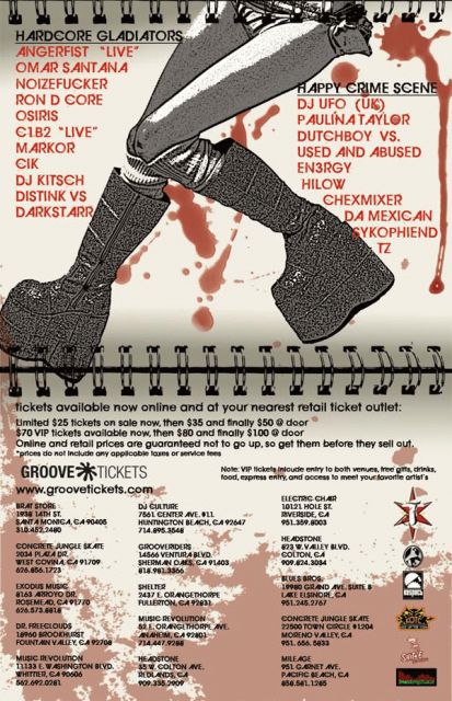 【Hardcore Gladiators】 - Angerfist "LIVE" (Holland, Masters of Hardcore) - Omar Santana (USA, H2OH) - Noizefucker (Holland, special forces) - Ron D Core (Dr.Freeclouds) - Osiris - C1B2 "LIVE" (Shit-E Rec) - Markor (NBR, Santa Barbera) - Cik (AZ Junkies, Arizona) - DJ Kitsch - Distink vs Darkstarr