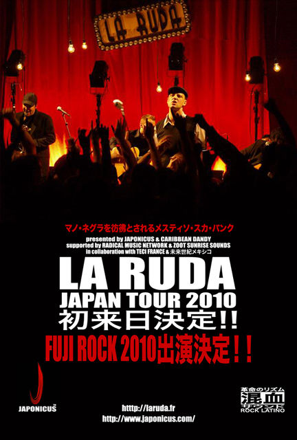 1993年、LA RUDA(ラ・ルーダ)の前身バンドであるLA RUDA SALSKA(ラ・ルーダサルスカ)は8人編成のSWING SKAバンドとして、フランスで結成された。これまでに6枚のアルバムと、2枚のライヴ盤をリリース。1996年に発表された“Le Prix du Silence”と1999年に発表された“L’Art de la Joie”は5万枚以上のセールスを記録。次にリリースされた“Le Passager du Réel”もヨーロッパで10万枚を超えるヒットを飛ばした。2003年にバンド名を現在の LA RUDA(ラ・ルーダ)に変更。男臭く、硬派でソリッドな音楽スタイルは変えずに、デビュー以来幅広い層の音楽ファンに支持され続けている。これまでに世界数十カ国で、900以上のライヴを経験。ストリートのライヴハウスから、Montreaux Jazz Festival、EurockéEnnes、Solidays、Rock for People Festival、Printemps de Bourges、Les Francofolies de La Rochelle、Cigale、Bataclan等の世界の大型野外フェス、フランス有数のコンサートホールまで、精力的に活動の範囲を広げている。そんなLA RUDAの待望の日本上陸がついに決定した。“Les Bonnes Manières”(2007) と“Grand Soir”(2009)の比較的最近リリースされた音源の素晴らしさには目を見張るものがあり、日本でも数々のDJがBest Album Of The Yearに挙げる程、人気が急上昇している。中でもストーリー性のある楽曲構成と、フランス語で一気に歌い上げるヴォーカルは黄金期のMANO NEGRAを彷彿とさせ、観客の心を鼓舞するだろう。過去には、The Skatalites、Misfits、Fermin Muguruza、The Selecter、Fishbone、Ska-P、New York Ska Jazz Ensemble、Jimmy Cliff、Sergent Garcia、Deftones、Motorhead、The Stranglers、The International Noise Conspiracy等のアーティストと共演。日本のBRAHMANのフランスツアーのサポートも務めている。RADIO CHANGO発、MESTIZO音楽シーンの大本命、LA RUDAからもう目が離せない!