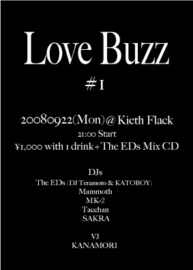 「Love Buzz」主宰。DJデビューはThe Salinger主宰のBeautiful Rock Night。その後、British Pavilion、Beams Christmas Party、Guilty Partiesなどでプレイ。何かを感じる曲が好きなジャンルを問わないB型の音楽Loverだが、NirvanaとJohn Fruscianteだけは譲れない。2 many djsも大好き!