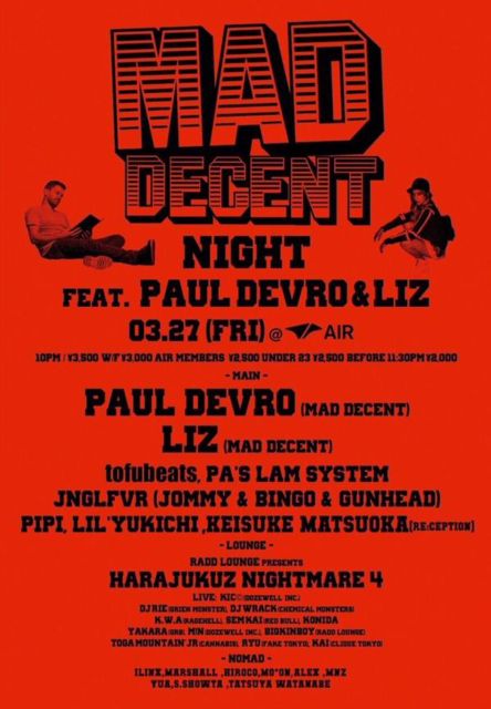 ----------------------------------------------------------------- 03.27.2015 FRI. Heineken GREEN ROOM SESSIONS presents MAD DECENT NIGHT feat. Paul Devro & LIZ INFORMATION 10PM \3500 Admission \3000 w/Flyer \2500 AIR members \2500 Under 23 \2000 Before 11:30PM