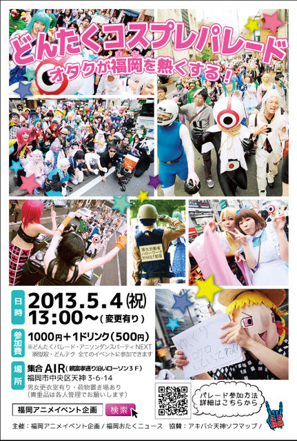 2012年、160名もの参加者で福岡中の話題をさらった「どんたくコスプレパレード」が開催! 今年は「どんたくコスプレパレード」×「アニソン・ダンスパーティーNEXT」×「瞬極殺」×「J-POP PARTY ハカタリーナ!」のスペシャルコラボレーションが実現 パレードも、NEXTも"コスプレ"で楽しめます!
