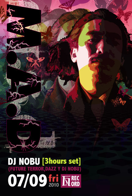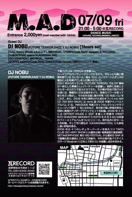 ○DJ NOBU(FUTURE TERROR,DAZZ Y DJ NOBU)○ 千葉FUTURE TERROR主宰兼DJ。ハードコアなパーティーフリークたちから、今もっとも熱い信頼を得ているDJの一人。彼は「DJ」というアートとダンスの魔法に人生を捧げてしまった類いのDJだ。 2001年から行っている「FUTURE TERROR」ではDIY精神が一体化した素晴らしいパーティーを披露し、純粋に音楽とエネルギーの力だけで拡大させてきた。その噂が各地で飛び火する頃には、積極的に日本全国をめぐり、音楽のパワーを使って彼らをぶっ飛ばし、その名を全国に馳せ年間100本近いDJをこなす。また、2006年末に発売された初のオフィシャルMIX CD「NO WAY BACK」はremix誌2006年度テクノベストアルバム2位、HMV 2006年度スタッフセレクションクラブミュージック部門1位になるなど、各方面で高い評価を得ると同時に異例のアンダーグラウンドヒットを記録。 2008年4月にはDETROIT HOUSEにEDITを施した問題作CREEP INTO SHADOWS MIDNIGHT D EDITSを 8月6日には待望のファーストアルバムをついにリリース。両作品共に好セールスを記録。そして宇川直弘の「UKAWANIMATION」にも参加し高い評価を得る。今年は4つのレギュラーパーティを抱えつつTAICO CLUB(SO VERY SHOWには最多出演)奄美皆既日食音楽祭、METAMORPHOSE等の BIG FESTIVALから場末のBARまで臨機応変な選曲とスキルで活動中。今年は現代版パラダイスガラージBerghainに日本人で初のDJを披露し成功を収める。