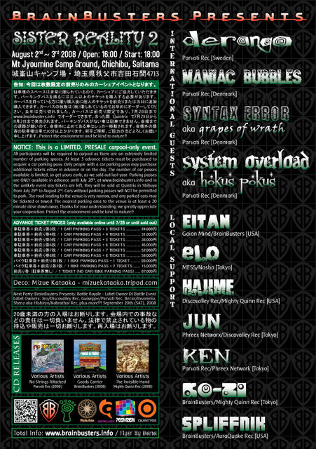 【Notice】 ★ 告知:今回は枚数限定の前売りのみのカーシェアイベントとなります。 駐車場のスペースは非常に限られているので、カーシェアにご協力していただきます。車で来る方はカーパスが必要となります。カーパスを得るには三人以上のチケットを購入する必要があります。カーパスを持っている方に限り購入後に個人のチケットを前売りまたは当日に追加購入できます。カーパスの枚数は限られているのでお早めにオーダーしてください。去年は売り切れました。カーパスは前売り限定であり、7月30日まで http://www.brainbusters.info/ でオーダーできます。余った際 Quintrix で7月31日から8月2日まで発売されます。カーパスがない車は駐車できません。会場までの道路が細いので、会場外に止めてある車はレッカー移動されます。会場外の最寄の駐車場は車で20分以上かかります。何卒ご理解、ご協力のほどよろしくお願い申し上げます。Protect the environment and be kind to nature!!