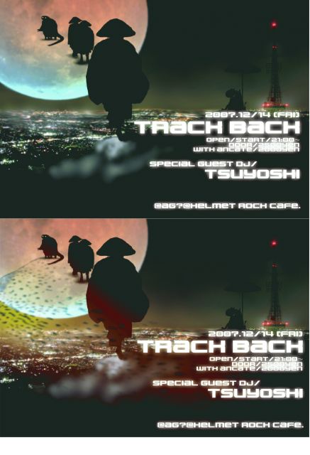 TRACK BACK VOL.1 2007/12/14(fri)@AZ&HELMETROCKCAFE OPEN/START/21:00 DOOR2500YEN みなさま!kaminakawa2007お疲れ様でした(笑)びっくりするくらい良いお祭りでしたね!そんなこんなで一ヶ月ちょい来ましたがイベントやってみたいと思います(笑) なんと!久々!!! DJ TSUYOSHIのサイケデリックセットが平塚のAZにて聞けます!VJには OVER HEADSを招き!SOUNDも Party animalと間違いないラインナップです!その他KAMINAKAWAのレジデンスDJ DAISANAも加わりかなり熱いイベントになると思います! -DJs- TSUYOSHI(http://www.tokiodrome.com/tsuyoshi.html)←音源聞けます! DAISANA and more…