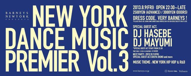 2013.8.9(FRI) OPEN 22:30~LATE BARNEYS NEW YORK PRESENTS NEW YORK DANCE MUSIC PREMIER Vol.3