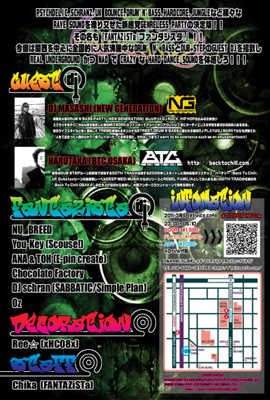 ゲストDJには西最大級DRUM'N'BASS PARTY【NEW GENERATION】のレジデントDJ ROCK, HIP HOP仕込みの2枚使いでスクラッチ等テクニカルな技を駆使したMIXWORKで常にオーディエンスの予想を裏切り圧倒的人気を誇るDJ MASASHI!! 世界のDUB STEPシーン最前線で活動するGOTH-TRADが主催する2006年にスタートした国内最強ダブステップ・パーティー「Back To Chill」の大阪開催”Back To Chill OSAKA”の立ち上げ当初から参加し、大阪アンダーグラウンドシーンで活躍中のDUB STEP DJ HARUTAKAの二人を招致!!!