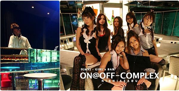 DJ&VJ?GIRL's BAR ON@OFF?COMPLEX(東京) 映像・音楽がミックスしたクラブであった渋谷の「DJ&VJ BAR ON@OFF」と、西麻布の「BAR&GALLERY FIGURE COMPLEX」の2つのコンセプトを融合し、更に進化させたお店です。幻想的な音楽と映像と、アーティスティックに表現された非日常の空間の中で、女性バーテンダーとの会話とともに、美酒をご堪能ください。 http://www.on-off-complex.com/index.html