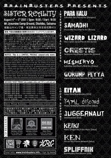 開催終了8月4日Para Halu, Samadhi, Wizard Lizard, Orestis, Hishiryo, Gorump Peyya + Local Support @ Sister Reality Open Air Party by BrainBusters
