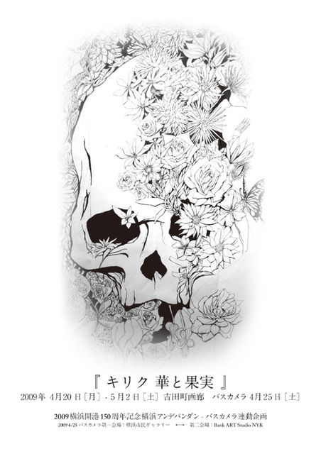 2009横浜開港150周年記念に伴い横浜アンデパンダン展が開催。 (第一会場 : 横浜市民ギャラリー 第二会場 : Bank ART Studio NYK) それに伴い横浜市民ギャラリーとBank ART Studio NYKを結ぶ便として4/25(土)バスカメラが運行されます。バスカメラに現代アーティストキリクにより絵が施されます。それに伴いその作品と連作を吉田町画廊にて4/20-5/2展示会開催致します。生と死をテーマに追い求めて来たキリクの新作、前回の個展『生殖』、生と死の一部分を切り取った個展から今回の『華と果実』へ、死を見つめる事による生の実感を得る試みの中で生の快楽を求めた作品群です。