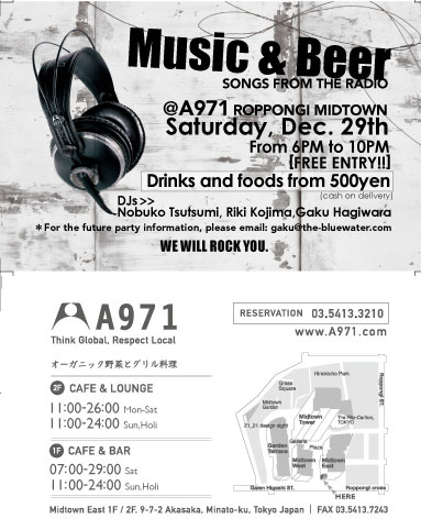 Music & Beer @ A971 in Roppongi Midtown - Songs from the Radio - 【日時】12/29(土) 18時〜22時 (音楽を掛けてる時間です。お店は朝までやってます!) Saturday Dec. 29th from 6PM to 10PM 【場所】東京ミッドタウン A971 (A971 (1st floor) in Roppongi Midtown) http://www.a971.com/ 港区赤坂9-7-2 東京ミッドタウン ミッドタウン・イースト 1F