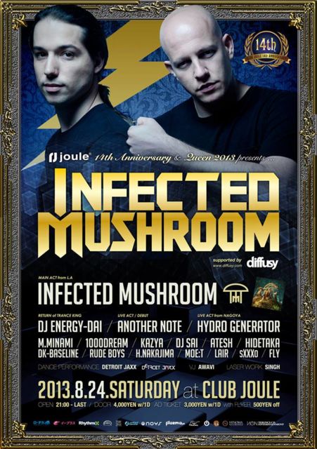エレクトロニック・ダンス・ミュージック(EDM)シーンの巨星、インフェクテッド・マッシュルーム(Infected Mushroom)は “サイケデリック・トランス” の先駆者として知られるイスラエル出身のユニット。 UK のDJマガジン誌による「ベスト10 DJ」に2回ランクイン、YouTube でのヒット数は1400万回を超え、ビルボード・チャート8位を記録するなど、現在 LA を拠点としているアミット・デュヴデヴとエレズ・アイゼンのデュオは、EDM シーンにおいてもっともパワフルな存在として君臨している正に世界が認めるトップアーティストが、大阪心斎橋のビッククラブ joule の14周年記念に出演が決定。 jouleで最も長い歴史を誇り、関西No.1 トランスパーティとして名高い "Queen" にて、Infected Mushroom の奇跡の来日公演が決定した。