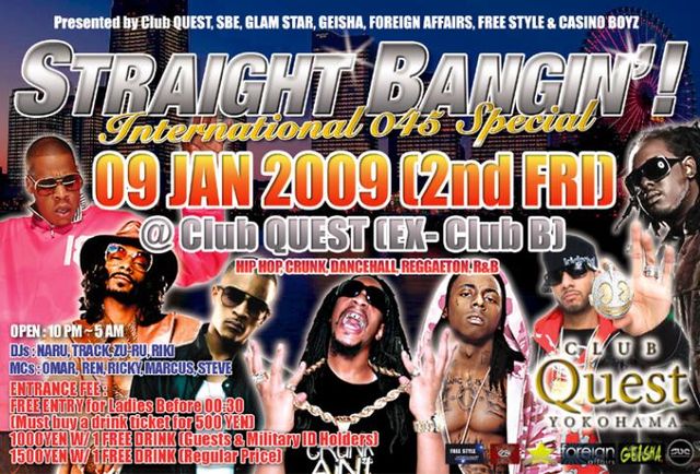 Entrance Fee : 女性入場無料!!(12時半まで。入場時ドリンクチケット1枚500円にて購入要) FREE ENTRY for Ladies before 00:30 (Must buy a drink ticket for 500 YEN)) 1000円 with 1 Drink (Guests & Military ID Holders) 1500円 with 1 Drink (Regular Price) *U.S Dollars are accepted at the event.