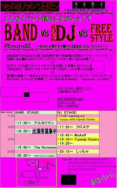 浜松窓枠で行われた第三回共伸PV祭りで突如現れ圧巻のパフォーマンスで世間に名を轟かせた?マクシミリアンソロモン率いるバンド勢!! vs DJダイノジ公認『ジャイコナイト名古屋』に所属しDJイベント『ENDLESS TRIP』のオーガナイザーDJしっちゃ率いるDJ隊!! vs 第三勢力参戦!!清水arkでのJ.S.N.D.にも参加しているフリースタイルチーム『Fujieda Stylers』が参戦!!football&baskeball represent fujieda!!