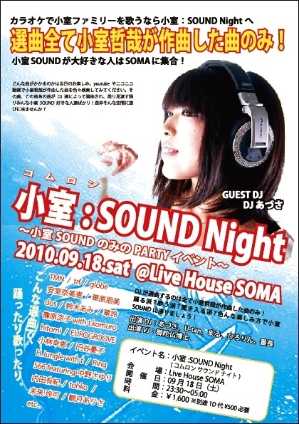 ☆選曲全て、小室哲哉が作曲した曲のみ。 ☆GUEST DJにはマンモスパーティー 『FILTER88』の大阪 Female DJ あづさ。 ☆Female DJ あづさが「彼の小室の選曲はヤバい」と推薦するDJ まる。 ☆アニソン界からDJ ひろりんとDJ 番長も参加。 ☆場所は東心斎橋だから交通が便利 ☆会場がLIVE HOUSEだから音は最高! ☆オールイベントでストレス発散!