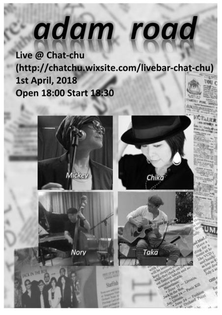 バンド名:adam road メンバー:Chika(Vo.)、Micky(Gt、Vo.)、Taka(Gt.)、Nory(Ba.)の4名 プロフィール:シンガポールで結成し、洋楽・邦楽問わずありとあらゆるジャンルを網羅し、当時の日本人バンド最強と言われた「Jack in the Box」のメンバーから派生して新たに日本で活動。 今回は、ソウル、AOR、J-POPをドラムレスのUnplugged 風に演奏します。