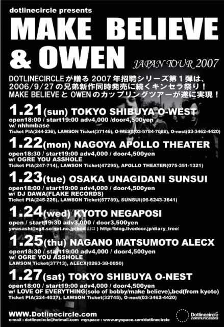 もはやシカゴの巨人と呼んでしまいたいJOAN OF ARC。そのバンドのキーを握るキンセラ兄弟が揃っての来日が決定!しかも2006年1月の初来日公演で職人的なプレイと衝撃的なパフォーマンスを脳裏に焼き付けて帰った兄ティム・キンセラ率いるミラクル天然4人組MAKE BELIEVE、そしてシカゴの珠玉の唄心を胸に秘めた弟マイク・キンセラのソロ・ユニットのOWENとして、別々のユニットによる奇跡のカップリング・ツアー!メンバーの収監を目前にして制作されたというMAKE BELIEVEは緩急と情念を吹き込んだ『Of Course』、そしてtim同様に父親の死、自身の怪我、そして自身の結婚など様々なドラマを経て完成させたOWENは『At Home With Owen』とそれぞれ傑作と謳うにふさわしいアルバムをキンセラ祭り第1弾として9月に同時発売したばかりの彼ら。今回はその第2弾としてのキンセラ兄弟カップリング・ツアー!JOAN OF ARCをはじめ、CAP’N JAZZ,AMERICAN FOOTBALL,OWLS,GHOSTS AND VODKAなど何かと日本で人気の高いバンドに関わってきているこの兄弟そしてメンバーを一度に堪能できる絶好のチャンス!(masato hoshino/cookie scene)