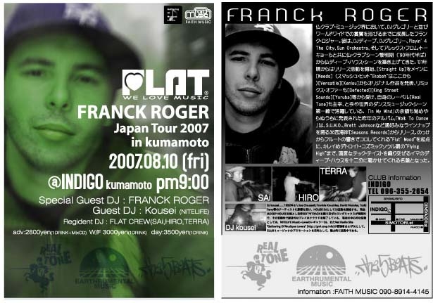 仏クラブ・ミュージック界において、DJグレゴリーと並びワールドワイドでの賞賛を浴びるまでに成長したフランク・ロジャー。彼は、DJディープ、DJグレゴリー、Playin' 4 The City、Sun Orchestra、そしてアレックス・フロム・トーキョーらと共に仏・クラブシーン黎明期 ('90年代半ば)から仏ディープ・ハウス・シーンを築き上げてきた。'01年頃からはリリース活動を開始、[Straight Up]をメインに[Needs] (スマッシュ・ヒット"Ekobah"はここから) [Versatile][Kenlou]からオリジナル作品を発表、リミックス・オファーも[Defected][King Street Sounds][Yoruba]等から受け、自身のレーベル[Real Tone]も主宰、と今や世界のダンスミュージック・シーン第一線で活躍している。「In My Mind」の余韻も覚めやらぬうちに発表された昨年のアルバム「Walk To Dance」は、S.U.M.O.、Brett Johnsonなど通好みなラインナップを誇る米西海岸[Seasons Records]からリリース。のっけからフルートの響きでコロしてれる"Flut' Mood"を起点に、キレイめデトロイト・コズミックソウル調の"Flying High"まで、適度なテック・テイストを織り交ぜるイマのディープ・ハウスを十二分に聴かせてくれる名盤となった。