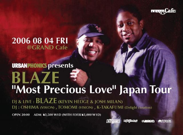 80年代にJosh Milan, Kevin Hedgeの2人によってNew Jerseyで結成されたBlaze。 DJであり、また伝説のクラブParadise GarageのLarry LevanやZanzibarでのTony Humphriesのプレイのファンでもあった二人は自然とプロダクションも手がけるようになり、84年にはColonel Abramsをフィーチャーし、今やガラージクラシックスと認識されている"If You Should Need a Friend" "Whatcha Gonna Do"をリリースする。 イギリスのポップグループABCのリミックスを手がけた事がきっかけてMotownレコードとの契約を取り付けたのが1989年のこと。 Chris Herbertという専属のシンガーを加えて制作されたBlazeのオリジナルアルバム"25 Years Later"を次の年にリリースし、"So Special"というクラブヒットがあったにもかかわらずMotownとの方向性の違いの為、レーベルから離れる事になる。 メジャーで無くても優れたインディペンデントのクラブシーンが存在する事に改めて気が付いた二人は、時には二人で、そして時には別々にプロデュースワークを積極的にこなして行く。 1993年には、King Street Soundsの第一弾リリースとなったBeat Freakのリミックスや、Althea McQueenをフィーチャリングした"Changes", Sabrynaah Popeをフィーチャリングした"It Works For Me"をプロデュース。1994年に、イギリスでトップ10に入るヒットとなったDe'Lacy "Hideaway"をリリース。また、その3年後にはTee Alfordをフィーチャーした"Lovelee Dae"とヒットさせる。その後リリースされたオリジナルアルバム"Basic Blaze"、日本のLifeline Recordsからの"Natural Blaze"と、ダンスミュージックの歴史を築いてきた彼等の活躍は皆の知るところだろう。 Kevin HedgeはNYの伝説的なクラブ、Shelterが2002年1月に再オープンした際からTimmy Regisford, Freddy Sanonと共にオーナーの一人としても名を連ねており、まさにNYの現在のクラブシーンの中心人物と言っても過言では無いだろう。(現在はWest End Recordsの運営の為、Shelterの運営から離れている。) 2003年9月にSlip N' Slideからリリースされたアルバム"Spiritual Speaking"には、Shelterのアンセムとなった"Breath", そして"Do You Remember House"といったトラックが収録されており、日本でもVictor Entertainmentからリリースされ大ヒットを記録した。2003年12月には待望の初来日を果たし、東京Garden Hall, 大阪Grand Cafe'で素晴らしいDJとライブセットを行った。 そして2004年初旬に、Joi Cardwell, Ultra Nate', Barbara Tucker, Byron Stingley, Kenny Bobian, Arnold Jarvisといったダンスミュージック界のスターアーティストを集めたアルバム、Blaze Presents Underground Dance Artists United for Life "Keep Hope Alive" が昨年の"Spiritually Speaking"に引き続きVictor Entertainment/King Street Soundsからリリースされた。 アルバムからのシングル"Most Precious Love"は、イギリスのDefectedに、ライセンスされ、Dennis Ferrer、Martin Solveig、Copyright、Frank Roger、そしてFreemason、Sergio Flores,Tsuyoshi Takashiro、Chocolate Pumaといった最強のリミキサー達によりリミックスが手掛けられ、Billboard Magazine、DJ Magといった、アメリカ、イギリスのダンスミュージック紙等で軒並みダンスチャートの1位を獲得し、2005−2006の、イビザ、マイアミWMCのアンセムとなる。そして、この夏、8月2日にJVC Victor Entertainmentより、これまでのBLAZEのヒット曲、未発表曲を、集めた、MOST PRECIOUS LOVE/BLAZE ESSENTIALが、発売され、8/4の大阪GRAND CAF?、8/5のYELLOWを皮切りに、URBANPHONICS presents BLAZE MOST PRECIOUS LOVE JAPAN TOURで、2年ぶりの来日が決定している。