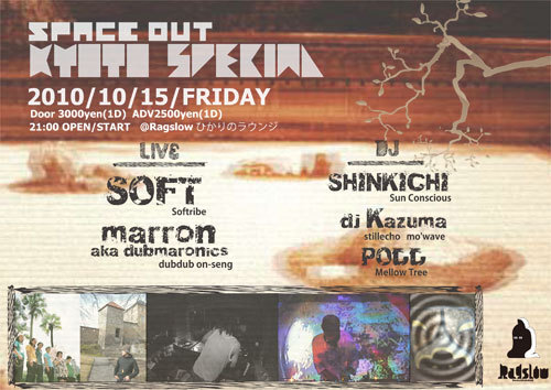 Ragslow&ひかりのラウンジ最強のパーティー!!From kyoto!!!!!!!!! LIVEは京都の至宝SOFTとdubdub on-seng のスマイリーギタートロニカプレイヤーmarron aka dubmaronics!!DJは元京都、現GOZA、SHINKICHI!! そしてstillecho、mo`wave等、関西アンダーグラウンドシーンで活躍するDJ Kazuma。そして、ユルくかつタイトなDJでKYOTOシーンを支えるPODD!!と、超ーーーーーーーーー豪華なメンツでSPACE OUT KYOTO SPECIALお届けします! これ以上無い最高のメンツでパーティーします!!ぜひお見逃し無く!!