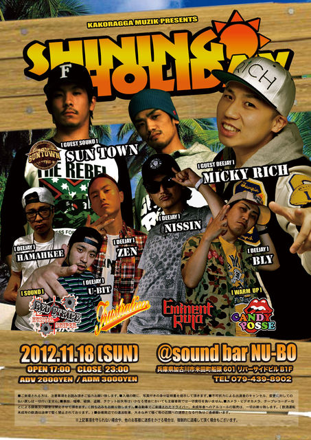 KAKORAGGA MUZIK PRESENTS… SHINING HOLIDAY 2012.11.18 (SUN) @加古川sound bar NU-BO OPEN 17:00 CLOSE 23:00 ADV 2000YEN ADM 3000YEN ※入場の際に1DRINK代別途要。