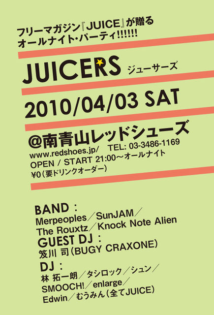 ★★タイムテーブル★★ 21:00〜21:45 オープン DJ タシロック 21:45〜22:15 The Rouxtz ライブ <転換> DJ シュン 22:30〜23:00 SunJAM ライブ <転換> DJ シュン 23:15〜23:45 Knock Note Alien ライブ <転換> DJ シュン 24:00〜24:30 Merpeoples ライブ 24:30〜01:10 GUEST DJ 笈川 司 01:10〜01:50 DJ 林 拓一朗 01:50〜02:30 DJ SMOOCH! 02:30〜03:10 DJ enlarge 03:10〜03:50 DJ Edwin 03:50〜04:25 DJ むうみん 04:25〜05:00 DJ タシロック〜 All