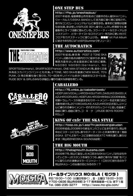 ONE STEP BUS(郡山) THE AUTOCRATICS(東京) CABALLERO(岡山) KING OF cafe' THE SKA STYLE(岡山) THE BIG MOUTH(岡山) 千鳥'S(おまけ) DJ オオカマ カズユキfrom 姫路 May(SOUND SKA)from 大阪 なまこ(RUDY STEP)from 大阪 DANNY(HEAT WAVE)from 大阪 とみ→(KING OF cafe' THE SKA STYLE) KUROKAWA(MILD STEP) TAKAHIRO(1977 RUDE BOYS) Toshihisa(Ambitious Box)