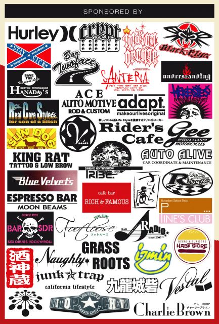 【SPONSORED BY】 BLACK FLYS ESPRESSO BAR INDIAN ORANGE BLUE VELVET'S フットルース 九龍城砦 SANTERIA GRASS ROOTS CRYPT NAUGHTY TWOFACE UNDERSTANDING VESTAL HABIT STORE BAR SDR PINE'S CLUB 居酒屋はな田 adapt Vida MOTORCYCLE SUN DOG ライダースカフェ STAY SICK Hurley RICH&FAMOUS AUTO ALIVE KING RAT さくら庵 izmin ROCK'N'ROLL RADIO REAL CORE STYLE JUNK TRAP ACE AUTO MOTIVE GEE HERESIES RIDERS CharliesBrown Hi-Top TRIBE 酒神蔵 poptoonstudio