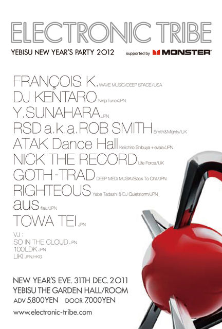 ゼロ年代の終わりとなる2009年に始動した最先端エレクトロニック・ミュージックによるカウントダウン・パーティー “ELECTRONIC TRIBE” 。昨年はDerrick Mayによる脅威の7Hセットを中心に多くのアーティストが参加し3500人以上のオーディエンスと共に、その幕を閉じた。そして2012年、再び、究極のワン・ナイト、ワン・グルーブが”YEBISU”で生まれる。世界でも唯一無二の存在感を放つFRANCOIS K.を筆頭に、大晦日に向けて特別なセットを準備してくれている日本が世界に誇るターンテーブリストDJ KENTARO、今年10年振りのオリジナル・アルバムを発表した電子音楽家Y.Sunahara、ブリストルを拠点にベース・ミュージックを牽引してきたRob Smithによるダブステップ・プロジェクトRSD。さらに、サウンド・アートの最先端、渋谷慶一郎とevalaによるユニットのATAK Dance Hall 、アンダーグラウンドで熱狂的な支持を受けるDJのNick The Record、日本が世界に誇るダブステップ・アイコンGoth-Trad。そして、国内クラブ・ジャズ界のパイオニアことU.F.O.の一員である矢部直とあらゆるサウンドを独自のサイケデリックな感覚で表現するDJ QUIETSTORMとのユニットRIGHTEOUS、映像作家TAKCOMとタッグを組み音とヴィジュアルを駆使した貴重なパフォーマンスを1年ぶりに披露するaus、そしてエレクトロニック・ミュージック界のカリスマTOWA TEIの総勢10組。
