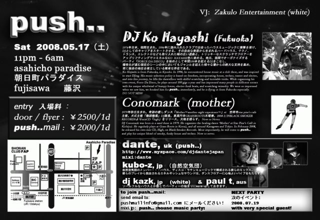 また湘南の一番楽しいハウス・ミュージック・パーティーをやります! 今回のゲストは、福岡県から呼んだKo Hayashiです! 彼はpush..のクルーには最近聴いた日本人のDJの中で最高ですよ!