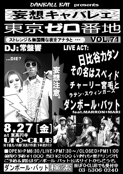 げっそりここは地の果て東京ゼロ番地!妄想し過ぎなストレンジ&無国籍&セクシーな出演者たちによるダイナミックなステージと、電気グルーヴ等のジャケット・デザインでもおなじみ常盤響センセイによる珍妙なDJプレイで眠れぬ魔都・東京の夜をキャバレェチックにハイジャック!Oh!モナムール!