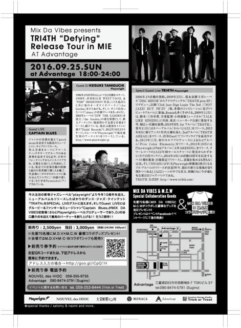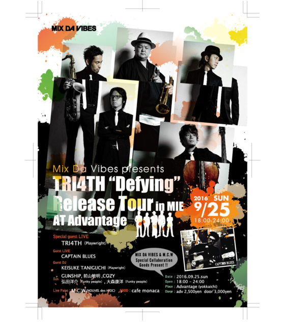 ★profile TRI4TH(Playwright) 2006年より活動を開始。2009年3月に、須永辰緒主宰レーベル”DISC MINOR”からアナログシングル「TRI4TH plus EP」でデビュー。以降「Club Jazz Digs Lupin The 3rd 」「NOT JAZZ!! BUT PE’Z!!! 」他、多数のコンピレーション及びトリビュートアルバムに参加。Remixも多く手がける。2009年11月には、脚本・三谷幸喜、音楽監督・小西康陽ミュージカル「TALK LIKE SINGING」に出演、東京・ニューヨーク公演に参加する等、幅広い活動を展開。 2010年8月、1st アルバム「TRI4TH」、翌年11月にはカバーアルバム「わらべJAZZ」をリリース。 2012年8月に新ピアニスト 竹内大輔を迎え、2nd アルバム 「TRI4TH AHEAD」をリリース、渋谷Duoにてワンマンライブを成功させる。2013年11月、初のセルフプロデュースによる3rd アルバム「Five Color Elements」をリリース。 2015年10月にはPlaywrightより4thアルバム「AWAKENING」をリリース、タワーレコードのJAZZ年間セールスチャートに発売からわずか1ヶ月で15位ランクイン。 2016年4月には活動10周年を記念するベスト盤を数量・店舗限定でリリースし、話題を集めるも間もなく完売。そして9月14日には早くもPlaywright移籍後2枚目となるフル・アルバムのリリースが決定!昨今、独自の新たな境地を切り開きつつあるJ-JAZZシーンの中でも実力、経験ともに今が最も旬な要注目ジャズ・バンドである。 TRI4TH 公式HP: http://www.tri4th.com/