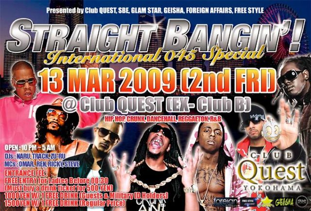 開催終了横浜Club QUESTにて今週の金曜日夜(3月13日)、最も熱いパーティーSTRAIGHT BANGIN’! 女性12時半まで入場無料(500円で1ドリチケを購入要)!!
