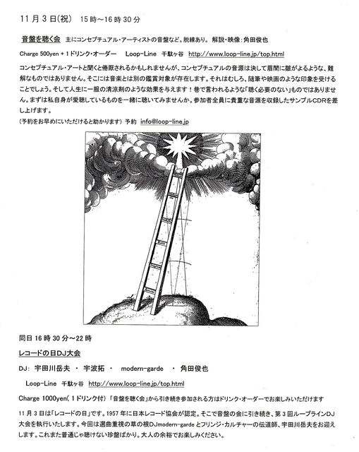 さて、11月3日は「レコードの日」です。1957年に日本レコード協会が認定。そこで音盤の会に引き続き、第3回偏屈DJ大会を執行いたします。今回は選曲重視の草の根DJmodern-garde氏とフリンジ・カルチャーの伝道師、宇田川岳夫氏をお迎えします。これまた普通に聴けない音盤ばかり。気ままにお楽しみください。