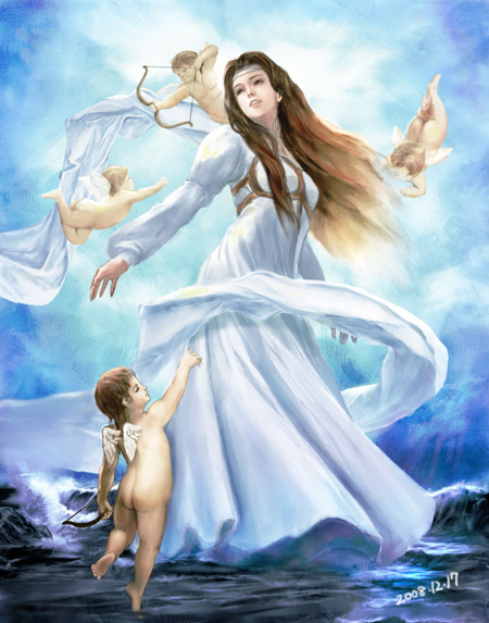 生まれて直ぐに西風の神ゼピュロスの息吹で地中海上を東に運ばれ、キプロス島まで運ばれました。そこで季節の女神ホライ達に祝福され、美しい衣装を纏い、オリュンポスの神々の仲間に迎え入れました。