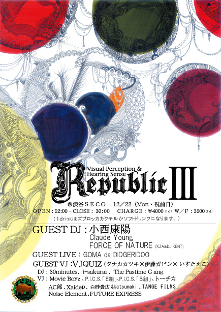 Special Guest VJ:QUIZ(タナカカツキ×伊藤ガビン× いすたえこ) (http://www.kaerucafe.com/ka2ki/) DJ:30minutes (N.D.inc) i-sakurai the Pastime Gang VJ:TOCHKA(トーチカ) Movie Boyz(大月壮、長添雅嗣、菅原そうた、清水康彦) AC部 Xaidep 白砂貴広 &Katsumaki Noise Element TANGE FILMS P.I.C.S.「E組」(西郡勲×木津裕史) P.I.C.S.「B組」(黒田賢・池田一真・清水邦仁・西村國芳) FUTURE EXPRESS Food:NIRO FOOD GRAPHICS