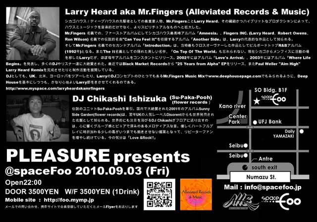 シカゴハウス/ディープハウスの先駆者としての最重要人物、Mr.FingersことLarry Heard。その繊細かつハイブリットなプロダクションによって、ハウスミュージックを音楽的だけでなく、よりスピリチュアルなものへと拡大した。 Mr.Fingers 名義での、ファーストアルバムにしてシカゴハウス最高峰アルバム『Amnesia』、Fingers INC. (Larry Heard、Robert Owens、Ron Wilson) 名義での伝説的名曲"Can You Feel It"を収録するアルバム『Another Side』は、Larryの代表的な作品として知られる。そしてMr.Fingers 名義でのセカンドアルバム『Introduction』は、当時最もクロスオーヴァーした作品としてビルボードトップR&Bアルバム(1992 年)となる。またThe It名義としての隠れた美しい名作、『On Top Of The World』も忘れられない。現在シカゴからメンフィスに活動の場を移したLarryだが、ほぼ毎年アルバムをコンスタントにリリース。2002年にはアルバム『Love's Arrival』、2003年にはアルバム『Where Life Begins』を発表し、多くのDJやリスナー達に大絶賛された。最近ではBlack Market Recordsから "25 Years from Alpha" EPをリリース、またPaul Weller "Aim High" Larry Heard Remixを完成させたりと制作活動を展開している。 DJとしても、UK、北米、ヨーロッパをツアーしたり、LarryのDJコンセプトのひとつでもあるMr.Fingers Music Mixやwww.deephousepage.comでもみられるように、Deep Houseを基本にしつつも、かなり心地よいLarry節をきかせてくれるのである。 http://www.myspace.com/larryheardakamrfingers ーーーーーーーーーーーーーーーーーーーーーーーーーーーーーーーーーーーーーーー