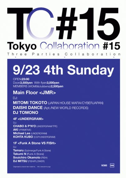 TokyoのNightシーンを彩る3つの個性的なPartyが渋谷WOMBにて融合。今回のTokyo Collaborationは、メインフロアを「JMR(ジャパン マフィア レコーディング)」と題して、レーベル主宰のMITOMI TOKOTOを中心にゆかりのあるアーティスト、DJ TOMONO、そしてDAISHI DANCEが札幌より参加する。4Fは2007年より始動したパーティーオーガナイゼーション「UNDERGRAM」が参加。Out Of Orbitを主宰のMARTINEZ、ポーランドよりSLGをそれぞれ初来日させ、今勢いに乗っているパーティの一つである。CHABO&P.N.O、AKI、Miicheal Leeを中心にHi-Tech-House をキーワードに現在進行形のダンスミュージックが体感出来るだろう!1FはTECH HOUSE・ELECTRO HOUSEを主体とした「Funk A Stone」が長崎を代表するパーティ「FISH」とのコラボレーションが決定。Tamaru、Takumi N、Souichiro Okamoto、MITSUの濃いDJの深いプレイから目が離せない。それぞれ個性的なパーティが集結し、普段と違ったパーティの楽しみが出来る1夜となるだろう!