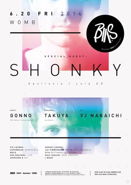 近年、様々な事由で失われつつある日本の音楽シーンにおいて、パーティー本来のあるべき姿を追求すべく WOMB が発信するプロジェクト、 BIAS 。 “We all have a BIAS for the real one...”をテーマとし、世界で今最も旬で、かつ実際のDJの良いアーティストを招聘します。 第一回目となる今回は、“Apollonia”としても活躍を続けている SHONKY がWOMB初登場! 。