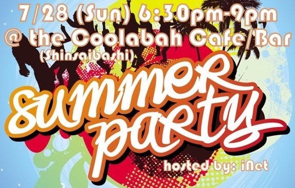 SUMMER FRIENDS PARTY 7/28(Sun) 18:30-21:00 Place: COOLABAH (Australian Cafe/Bar) Directions from Namba subway station: Go out of exit 25 and walk north over the Dotombori River. You will see Spotaka store on the left. Take a left on this street. Walk about 250 meters pass APA hotel and you will see Coolabah across from 100 yen Lawson. Tel. 06-6213-5153 HP: http://www.coolabah.jp