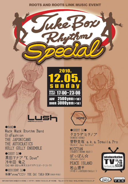 -------------------------------------- ROOTS AND ROOTS LINK MUSIC EVENT!! MOD/SKA/SWING/SOUL/ROCK ...and ALL DANCEMUSIC!! ■JUKEBOXRHYTHM SPECIAL!! 2010/12/5(sun) 渋谷LUSH & HOME http://www.toos.co.jp/lush/ http://www.toos.co.jp/home/ OPEN/START17:00〜23:00 adv¥2500(+1D) door¥3000(+1D)