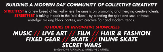 StreetFest will be tenhours of innovative showcases – featuring music, live art, films, hair and fashion shows plus fixed gear biking, rollerblade and skateboard demonstrations, all from some of the UK’s top collectives, this is not an event to miss.