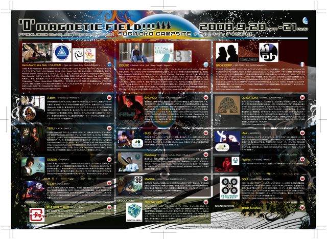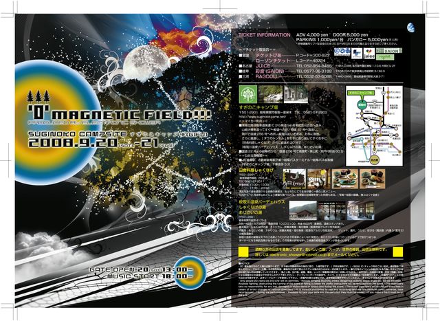 THE ELECTRONIC SHOWER IN SEPTEMBER !!! 『'0'MAGNETIC FIELD!!!』 (PROGRESSIVE,TECHNO,MINIMAL,ELECTRO,BREAKS,AMBIENT,LOUNGE,etc...) 9/20(SAT)-21(SUN) @すぎのこキャンプ場(GIFU) 〒501-2901 岐阜県関市板取一里保木 0581-57-2902 http://www.suginoko-camp.net/
