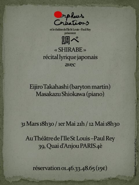 Masakazu SHIOKAWA (piano) et Eijiro TAKAHASHI (baryton martin) nous font découvrir le répertoire lyrique nippon lors de leur récital "SHIRABE". Rendez vous dans ce charmant théâtre parisien situé sur l'île saint Louis