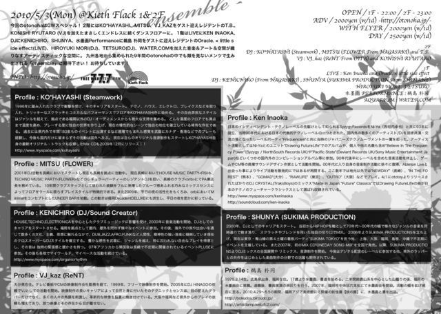2F DJ : KO*HAYASHI (Steamwork) , MITSU (FLOWER From NAGASAKI) and T.B. VJ : VJ_kaz (ReNT From OITA) and KONISHI RYUTARO