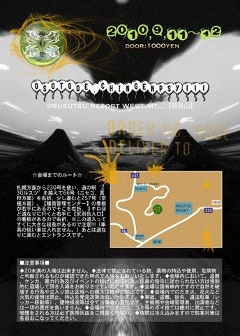▲20歳未満の入場は出来ません。▲法律で禁止されているもの、薬物の持込や使用、危険物と判断されるものが確認できた時点で入場をお断りいたします。▲会場内において、盗難、ケンカ、暴力行為及びイベントの妨げになる行為、係員の指示に従わない方は強制的に退場して頂き入場をお断りさせていただきます。▲会場内は国有林内ですので自然を破壊する行為や立ち入り禁止区域への侵入は絶対に禁止です。▲会場内でのたき火、花火など火気の使用は禁止です。持込を発見次第没収いたします。▲事故、盗難、紛失、違法駐車(レッカー移動等)、建物損害等はすべて当事者の責任です。主催者側や会場管理者、出演者などは一切責任を負いません。▲会場内でのタバコ、ゴミのポイ捨ては絶対に禁止です。喫煙をされる方は必ず携帯灰皿をご用意下さい。▲夜間は冷え込みますので防寒対策は各自おこなってください。