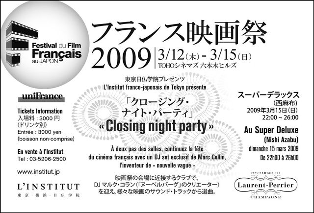 ■Super Deluxe (Nishi Azabu) Sunday march 15th 2009 ■スーパー・デラックス(西麻布)2009年03月15日(日) ■Tel: 03-5412-0515 www.super-deluxe.com ■Open & start : 10 pm to 2 am/22時〜26時 ■入場料:3000円(ドリンク別)Entrance : 3000 yen (plus drink) ■ 東京日仏学院で好評発売中!Tickets on sale now at l’Institut Tel: 03-5206-2500 www.institut.jp ■「Closing Night Party」協力/Supported by : Champagne Laurent Perrier