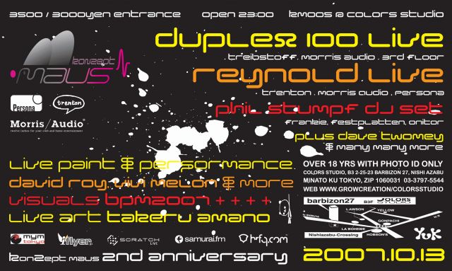 This will be accompanied by live art, dance & performance by local hero TAKERU AMANO (Crossmountain / Pan-t.com) & friends plus the interactive & multi-disciplinary "Ghost Dancer" will be performed by Maus & Redbox talents DAVID ROY, VIVI MELON & guests. Riding high from his recent YUK event success, Maus chef DAVE TWOMEY will be adding his spice in the main floor with full support in the lounge by special guest KIKIORIX (Adrift / Ladiues & Gentlemen) with TAMAKI (Yuk), YUKI (Scorpion), A/FLOOR & UUUKI (YUK), JASON SAINT (Hi-Fi) & SHINGO*420 & more in support. The last event saw 300 people pack out Colors to PAUL RITCH's bowel crunching & funky sounds and the 2nd anniversary looks likely to be even bigger. Expect the extraordinary & of course the usual Maus surprises. Dave has his heart set on incorporating a number of colored & live painted road cones for the occasion ... who know what the hell they will create from that.