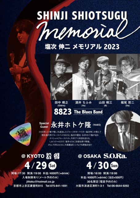 ●4/29(土)塩次伸二メモリアル2023@京都 拾得 8823 The Blues Band 酒井ちふみ(Vo)田中晴之(Gt)山田晴三(B)堀尾哲二(Ds) Special Guest:永井ホトケ隆(Vo & G) 開場17:30 開演19:00料金 4000円(+drink) 拾得ライヴ予約メールのみ:jittoku@hotmail.co.jp 京都市上京区大宮通下立売下ル菱屋町815 Tel:075-841-1691 http://www2.odn.ne.jp/jittoku/