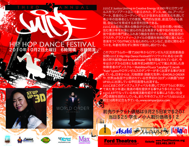 元格闘家の須藤元気さんが10月2日土曜日にハリウッドのFord Amphitheater で行われるJ.U.i.C.E Hip Hop Dance FestivalにWorld OrderとStep Up 2/3Dに出演した甲田真理さんa.k.a Jenny Kidoと 踊ります。その数日前にはWeekly LALALA主催のビジネス交流会にて須藤元気さんのトークショーも行われます。皆さんそろってご参加下さい。会場はトーランスのミヤコハイブリットホテルです。