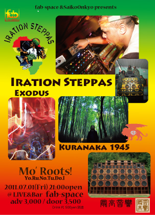 日も長くなり、暖かく過ごしやすい季節になってきまし たね。楽しみにしていた前回のRoots!、震災の影響でGuestも来日できず、イベントも中止となってしまってたのですが、急遽、来日が決定し、 IRATION STEPPASが今度こそ姫路fab-spaceにやってきてくれます!UKのSoundSystemの巨匠 IRATION STEPPAS。更に、UK DUBSTEPのEXODUS、そして、fabには久しぶりに登場のZETTAI-MU 1945 KURANAKAと言うメンツ。そんな彼らを最高音響が爆音でお出迎えします。めったに味わう事ができない本場UKの極太BASE MUSIC meets最高音響!!!!! お楽しみに〜♪♪もちろん、無添加、玄米のfab-curryや手作りお菓子もお腹をすかせたあなたを早い時間から待って ます。今回のRoots!は、前回のリベンジという気持ちを込めて”Mo’Roots!! (もっとルーツ!)”です。それから当日のLIVEは早い時間になっています。絶対にお見逃しなく!